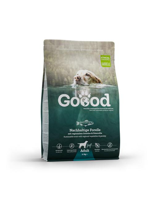 Kartoffel*, Forellenmehl aus nachhaltiger Zucht (25%), Sonnenblumenöl (4%), Lignocellulose, Rübenmelasseschnitzel* (entzuckert), Geflügelfett, Leberhydrolisat, Leinsamen (1,5%), Apfeltrester*, Rapsöl (1%), Natriumchlorid (aus Meersalz), Karotten*, Pastinake*, Petersilienwurzel* (0,3%), Petersilienblatt*, Muschelfleisch* (regionale Gemüsemischung gesamt 1%);