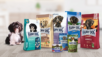 Das Sortiment von Happy Dog umfasst neben Trocken- und Nassfutter auch leckere Snacks und Ergänzungsfuttermittel.