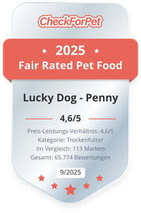 Von allen eingehenden Bewertungen zu Lucky Dog - Penny Hundefutter (2.012 Bewertungen) haben 124 Hundebesitzer das Lucky Dog - Penny Herzhafte Brocken Hundefutter bewertet. Lesen Sie hier die individuellen Meinungen, vergleichen Sie den Preis oder bewerten Sie das Lucky Dog - Penny Hundefutter. Mit dem individuellen und auf Ihren Hund zugeschnittenen Futtercheck können Sie selbst schnell das bestbewertete und passende Hundefutter finden.