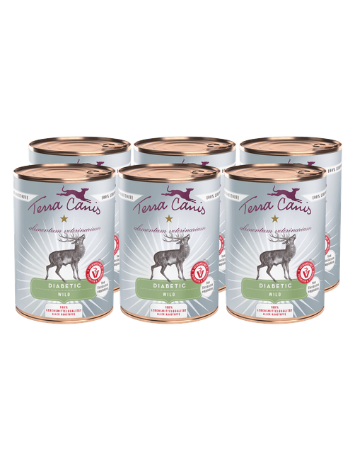 Besonderer Ernährungszweck der Diabetic Diät: Regulierung der Glucoseversorgung (Diabetes Mellitus) Hunde, die an Diabetes erkrankt sind, müssen ihr Leben lang Insulin bekommen. Ergänzend dazu sollten sie so ernährt werden, dass der Blutzuckerspiegel stabil bleibt. In den DIABETIC DIÄT-Menüs ist ausschließlich reines, lebensmittelechtes Muskelfleisch verarbeitet, während auf Getreide verzichtet wird. Hochverdauliches Muskelfleisch liefert gesunde Aminosäuren und Omega-6-Fettsäuren ohne die Bauchspeicheldrüse zu belasten. Erhöht ist in allen DIABETIC DIÄT-Menüs der Anteil an natürlicher Rohfaser aus Gemüse, Obst und Kräutern, um für eine verlangsamte Passage des Futters durch den Darm zu sorgen, wodurch die Nährstoffe konstant in die Blutbahn abgegeben werden. Zugesetzt sind die in der Forschung im Fokus stehenden Blaubeeren, die durch ihre sekundären Pflanzenstoffe, allen voran die Anthocyane, eine unterstützende Rolle gegen die Zuckerkrankheit spielen sollen. Artischockenblätter, Aloe Vera und Kreuzkümmel sind bekannt dafür, den Blutzuckerspiegel gleichmäßig zu halten, insbesondere sogenannte „Zucker-Peaks“ zu verhindern, und sich positiv auf den Cholesterinspiegel auszuwirken. Der enthaltene Bockshornklee gilt als blutzuckersenkend und damit als antidiabetisch. Ebenso soll Lupine eine insgesamt senkende Wirkung auf den Blutzucker haben und liefert zudem wertvolle Aminosäuren. Salbei und Thymian unterstützen durch ihre Vielfalt an Antioxidantien und sekundären Pflanzenstoffen. Der enthaltene Ginseng ist bekannt für seinen positiven Effekt auf Diabetes und die Fähigkeit den Blutzuckerspiegel zu senken. Diabetes Mellitus ist eine Erkrankung, der eine endokrine Störung zu Grunde liegt. Es werden Diabetes Typ 1 und Typ 2 unterschieden. Während bei Diabetes Typ 1 zu wenig Insulin in der Bauchspeicheldrüse produziert wird, liegt bei Diabetes Typ 2 eine Resistenz gegenüber Insulin vor, so dass die Wirkungsweise eingeschränkt oder aufgehoben ist. Der Diabetes Typ 1 tritt klassischerweise bei jungen Tieren mit genetischer Disposition und eher schlankwüchsigen Tieren auf. Diabetes Typ 2 ist der sogenannte „Altersdiabetes“, der überwiegend bei Hundesenioren und übergewichtigen Tieren auftritt. Bei Adipositas-Patienten kann dieser Typ reversibel sein, wenn das Normalgewicht wieder erreicht ist. Liegt zu wenig Insulin vor oder entfaltet es nicht seine volle Wirkung, so wird die Glukoseaufnahme in die Zellen verhindert, was einen massiven Glukoseanstieg im Blut zur Folge hat. Neben Polydipsie (vermehrtes Trinken) und Polyurie (erhöhter Harnabsatz) sind eine herabgesetzte Leistungsfähigkeit, Polyphagie (gesteigerter Appetit) und Katarakt (als Spätfolge Linsentrübung) klassische Symptome bei Diabetes. Mögliche Ursachen für eine Diabetes Erkrankung sind Adipositas, genetische Prädisposition, Pankreatitis und Glukokortikoidverabreichung. Übergewicht gilt heutzutage jedoch als eine der Hauptursachen für das vermehrte Auftreten der sogenannten „Zuckerhunde“. Diätalleinfuttermittel für Hunde.