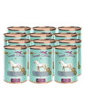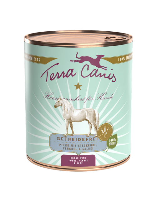 Terra Canis GETREIDEFREI-Menüs weisen einen hohen Fleischanteil von 60 % – 70 % auf, ergänzt durch viel gesundes, ballaststoffreiches Gemüse, Obst und Kräuter. Zusätze wie Seealge, Mineralerde, Eierschalenpulver, Blütenpollen und Bierhefe liefern zahlreiche, natürliche Vitamine und Mineralstoffe. Das enthaltene hochverdauliche, cholesterin- und glutenfreie Kokosmehl ist ein wahres Wundermehl. Es gilt als eine der ergiebigsten Ballaststoffquellen, ist sanft zum Darm und enthält ein breites Angebot an wichtigen Aminosäuren. Leinöl mit seinem hohen Gehalt an Omega-3-Fettsäuren rundet die GETREIDEFREI-Menüs ideal ab. Geeignet sind diese Menüs für alle gesunden Hunde, deren Halter auf eine artgerechte, getreidefreie Ernährung setzen. Besonders geeignet für Hunde mit Unverträglichkeiten gegen Getreide sowie für Hunde, die aus medizinischen Gründen getreidefrei ernährt werden sollten. Mit dem Konzept „Hundenahrung in 100 % Lebensmittelqualität aller Rohstoffe“ setzte Terra Canis vor 15 Jahren völlig neue Qualitätsmaßstäbe in der Futtermittelbranche. Denn erstmalig wurde Tiernahrung – dank einer Sondergenehmigung der Bayerischen Futtermittelbehörde – in einem echten Lebensmittelbetrieb, der Münchener Traditionsmetzgerei Schäbitz, hergestellt. Möglich wurde dies, da hier seit Beginn ausschließlich Rohstoffe verwendet wurden, die zum Zeitpunkt der Verarbeitung aufgrund ihrer Frische und Qualität offiziell für Humannahrungsprodukte zugelassen sind. Diese kompromisslose Qualität und der damit verbundene leckere, appetitliche Geruch der Menüs unterscheidet Terra Canis-Menüs seit Anfang an von allen anderen Produkten auf dem Markt. Durch die stetig steigende Nachfrage ist die Metzgerei im Herzen von München an ihre Kapazitätsgrenze gekommen. Da für Terra Canis die Qualität das oberste Gebot ist, werden die Menüs ab sofort in unserer neuen, eigenen Manufaktur vor den Toren Münchens produziert. Die Herstellung der Produkte in den „eigenen vier Wänden“ erlaubt maximale Kontrolle der Rohstoffqualität. Zudem wurden die drei Metzgermeister der Münchner Metzgerei Schäbitz mit ihrem gesamten Team übernommen, und damit jahrzehntelange Erfahrung und Expertise des Metzgerhandwerks. Alle verwendeten Rohstoffe, die Produktionsstätte sowie das Hygiene-Konzept unterliegen zu 100 % Lebensmittelstandards. Alleinfuttermittel für Hunde.