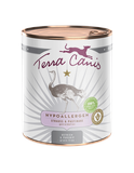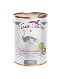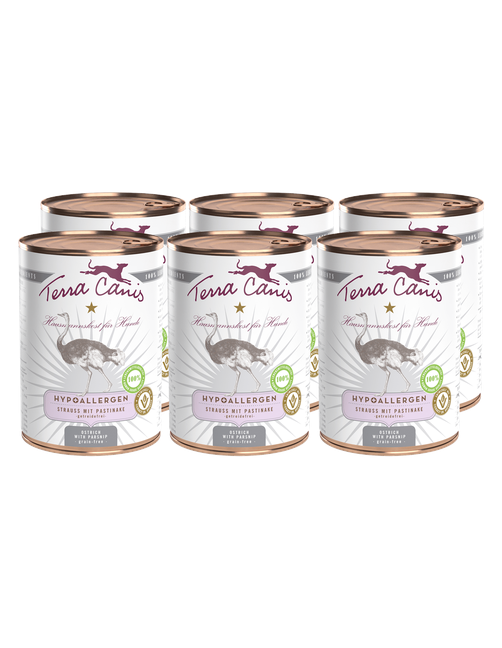 Terra Canis Hypoallergen – Höchste Qualität für allergiegeplagte Hunde Gerade für Hunde mit Allergien und Unverträglichkeiten ist eine maximale Rohstoffqualität elementar. Die Terra Canis HYPOALLERGEN-Menüs bestehen aus reinem Muskelfleisch (60 %) einer einzigen, exotischen Proteinquelle. Dieses Fleisch wird durch ein allergenarmes Gemüse ergänzt. Rapsöl liefert hochwertige Fettsäuren und ist dafür bekannt, den Magen-Darm-Trakt zu unterstützen sowie Haut und Fell positiv zu beeinflussen. Ein ausgewogener Vitamin-Mineralstoff-Mix sichert die Versorgung des Hundes mit allen essentiellen Vitaminen, Mineralstoffen und Spurenelementen. Terra Canis HYPOALLERGEN ist geeignet für Hunde mit Futtermittelallergien/-unverträglichkeiten und zur Durchführung einer Ausschlussdiät. Terra Canis HYPOALLERGEN konnte in wissenschaftlicher Studie* beweisen, dass keine Verunreinigung einer Fremd-DNA vorliegt. In dem renommierten Magazin „Veterinary Dermatology“ wurde eine Studie* von internationalen Tierärzten veröffentlicht. Geprüft wurde die Sorte Terra Canis HYPOALLERGEN Pferd. Als einzige hypoallergene Feuchtnahrung einwandfrei und ohne jegliche Verschmutzung einer der fünf getesteten Fremd-DNA hat Terra Canis HYPOALLERGEN abgeschnitten. Im Ergebnis der Studie konnte bei 9 von 12 Produkten namhafter Hersteller die DNA von einer oder von mehreren der fünf getesteten Tierarten, die nicht deklariert waren, gefunden werden. Am häufigsten konnte die DNA von Rind (8 Produkte) und Schwein (6 Produkte) nachgewiesen werden. Wann ist welche Magen-Darm-Linie sinnvoll? Weiterführende Informationen dazu finden Sie hier. *„Detection of DNA from undeclared animal species in commercial elimination diets for dogs using PCR“ (Horvath-Ungerboeck, Widmann, Handl; Veterinary Dermatology 2017; 28:373-e86) Warum sind diese Menüs teurer? Neben der ausschließlichen Verwendung von Muskel- und Herzfleisch und der 100%igen Lebensmittelqualität aller Rohstoffe macht der extrem hohe Marktpreis für Strauß-, Kamel-, Büffel-, und Kängurufleisch dieses Produkt etwas teurer. Dieses Fleisch kostet je nach Sorte teilweise doppelt bis dreifach so viel wie z.B. Rinder-, Puten- oder Hühnerfleisch. Es muss als Tiefkühlware aus Australien und Südafrika importiert werden. - Entwickelt mit Tierärztin Hanna Stephan - Verarbeitung von ausschließlich Muskel- und Herzfleisch einer allergenarmen Proteinquelle und einer einzigen Gemüsesorte (Süßkartoffel, Topinambur oder Pastinake) - Zugabe von Rapsöl - getreide- und laktosefrei - Zusatz von Vitaminen, Mineralstoffen & Spurenelementen in Lebensmittelqualität Alleinfuttermittel für Hunde.