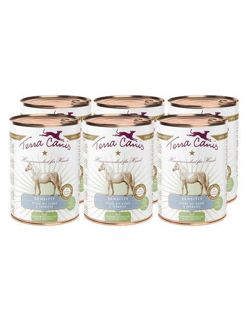 Keine Futtermittelallergie, aber einen empfindlichen Magen und eine anfällige Verdauung? Es gibt viele Gründe, warum ein Hund ernährungssensibel auf Nahrung reagiert. Die Sensitiv-Linie ist auf verdauungsempfindliche Hunde ausgerichtet und schließt die Lücke zwischen den Linien Classic / Getreidefrei und Hypoallergen. Leicht verdauliches Fleisch von Huhn, Kaninchen oder Pferd bildet die Grundlage der getreidefreien Sensitiv-Menüs, die mit einer allergenarmen Zusammensetzung auf empfindliche Hundemägen zugeschnitten ist, um deren Verdauung zu entlasten. Ergänzt wird das Fleisch durch basische Zutaten wie Kartoffeln, leicht verdauliche Gemüsesorten sowie eine gut verträgliche Obst- oder Beerensorte. Besonders an den Sensitiv-Menüs ist der einzigartige Sensitiv-Komplex zur sanften und rein natürlichen Unterstützung der Verdauung, Darmflora und Magenschleimhaut. Der Terra Canis SENSITIV-Komplex Um verdauungssensible Hunde in ihrer Ernährung auf sanfte Weise zu begleiten, kommen mit dem einzigartigen Terra Canis Sensitiv-Komplex Pflanzen, Kräuter, Mineralstoffe, Spurenelemente, Fettsäuren und sekundäre Pflanzenstoffe in den Napf, welche die Verdauungsorgane, die Magen-Darm-Schleimhaut sowie die Darmflora auf natürliche Weise unterstützen. Mineralerde sorgt für einen ausgeglichenen Säure-Basen-Haushalt und fördert damit zusammen mit Flohsamenschalen eine gesunde Magenschleimhaut des Hundes. Außerdem sind die patentierten Emiko® Probiotika (Effektive Microorganismen) enthalten, die die Verdauung unterstützen und eine ausgewogene Darmflora fördern. Die in der traditionellen Pflanzen- und Naturkunde für ihre positive Wirkung auf Magen und Darm bekannten Kräuter Mädesüß, Kamille, Kümmel & Ulmenrinde unterstützen den Hund zusätzlich. Eine Wohltat für jeden Darm ist das enthaltene hochverdauliche glutenfreie Kokosmehl, welches viele wertvolle Ballaststoffe liefert und eine gesunde Darmfunktion fördert. • Die Kräuter MÄDESÜß, ULMENRINDE, KAMILLE und KÜMMEL sind in der Natur- & Pflanzenkunde für ihre positive Wirkung auf die Verdauungsorgane bekannt. • Die zugefügte EMIKO ® EM-Mischung enthält Probiotika, die eine ausgeglichene Darmflora unterstützt. • KOKOSMEHL ist proteinreich, fettarm und cholesterinfrei und damit eine Wohltat für den Darm. Es zählt zu den ergiebigsten Ballaststoffquellen und fördert eine intakte Verdauung. • Die in FLOHSAMEN enthaltenen löslichen Ballaststoffe sind vor allem für ihre positiv regulierende Wirkung auf die Verdauung und Magen- und Darmschleimhaut bekannt. • Dem SCHWARZKÜMMELÖL werden sehr viele positive Eigenschaften zugesprochen, die auch wissenschaftlich belegt sind. Es gilt u. a. als antioxidativ und fördernd für eine ausgeglichene Darmperistaltik. • MINERALERDE unterstützt einen gesunden Säure-Basen-Haushalt. Wann ist welche Magen-Darm-Linie sinnvoll? Weiterführende Informationen dazu finden Sie hier. Was sind EM-Bakterien?