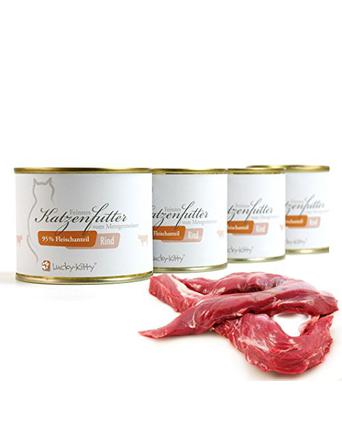 Lucky Kitty setzt auf das sogenannte Kaltabfüllverfahren. Klingt technisch? Ist aber super sinnvoll! Dabei wird das Futter bei etwa 4 Grad kalt in die Dose gefüllt und erst danach schonend mit heißem Dampf gegart. Dieses Verfahren verhindert Bakterienwachstum beim Abfüllen und sorgt gleichzeitig dafür, dass hitzeempfindliche Vitamine und Enzyme weitgehend erhalten bleiben. Es wird kein Wasser zugesetzt – auch nicht versteckt als Brühe. Deine Katze bekommt also reines, konzentriertes Futter ohne verdünnte Nährstoffe. Ein weiterer Vorteil: Der Eigengeruch und -geschmack des Fleisches bleibt intensiver erhalten. Viele Samtpfoten, selbst die wählerischsten, sind von Lucky Kitty geschmacklich sofort überzeugt.