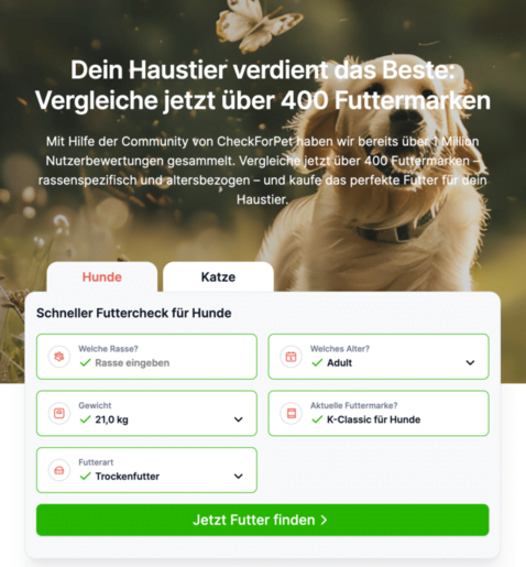 Auch nach Rückrufaktionen bleibt die wichtigste Frage: Fütterst du überhaupt das richtige Futter? Unser kostenloser Futtervergleich analysiert über 2.500 Marken und findet das perfekte Futter für dein Tier.